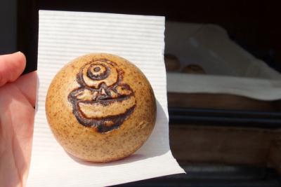 お饅頭は甘さ控えめのこしあんで、目玉のおやじの焼き印がおされています。こちらは持ち帰り用の販売もありました。- 旅行時期
