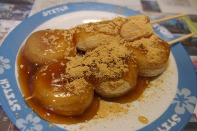 小麦粉から作られたふわふわのお団子。トロっとしたみたらしのタレは醤油っぽさは感じず、黄粉と混ざって優しい甘さです。