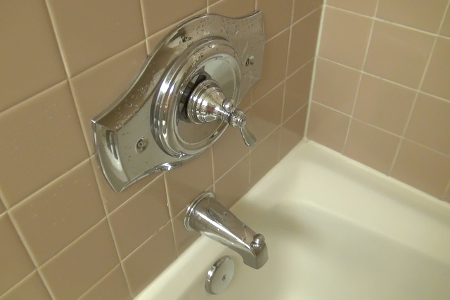 取手を手前に引くと下の蛇口からお湯が出てきて、蛇口の上のでっぱりを押すとシャワーになります。水圧は充分、取手を左右に捻ると温度の調節ができます。