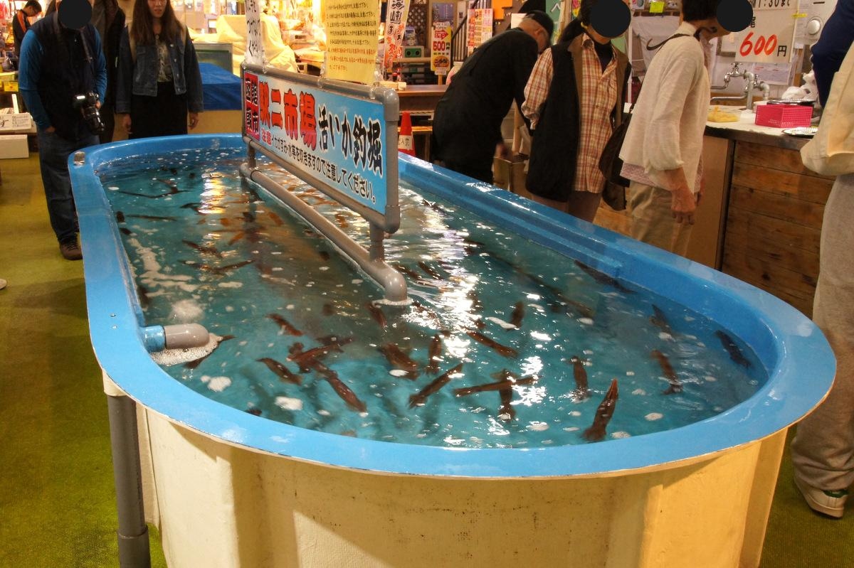 釣りといってもイカの耳に針を引っ掛けるだけなので簡単です。イカはスタッフさんが針から外してバケツへ入れてくれました。釣り上げた時に水や墨を吐くこともあるらしいので要注意です。