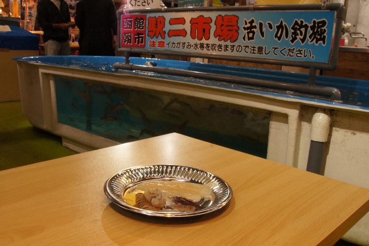 お皿に盛り付けてもらったら生簀付近のテーブルでいただきます。醤油をつけると色が変わったり、足を食べれば吸盤が吸いつく体験は初めてでした。- 旅行時期