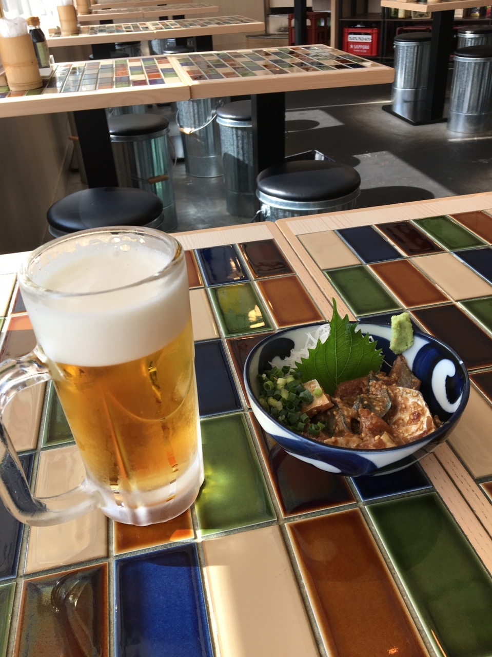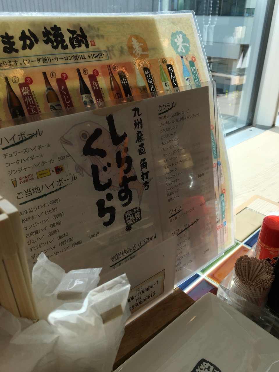 お店は入口付近がスタンディング(立ち飲み用)、店内奥(窓際)が座って楽しめるスペースになっています。立ち飲み用スペースでは、センベロコースがあり、1,000円でドリンク3杯とおつまみ1皿が注文できるようですね。