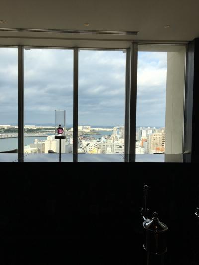 客室はまずロビー階の14階に行ってから、その後宿泊フロアに下がるスタイル。今回アサインされたのは10階の角部屋。天井から床まで全面ガラス張りの部屋で、ベッドから那覇市内を一望でき、眺望を満喫しました。