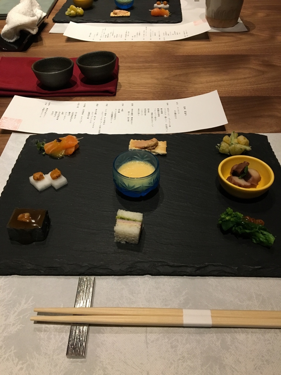 両親の金婚式のお祝いで利用しました。場所は品川駅港南口から徒歩5分。三菱重工ビル1階にある懐石料理店です。今回はお祝いだったので、ランチの懐石➕飲み放題9720円を予約しました。ビジネスビルのテナントなので、入口はいまいちな印象でしたが、店内に入ると雰囲気が一転。今回は個室を予約済みでしたが、ソファのゆったりとした、まるでシガーバーのような内装、4人にも関わず、10人くらいは座れる立派なお部屋でした。席に着くと、すぐ担当スタッフが紹介され、前菜からスタート。平皿に10種類近くの手が込んだ間違いなく女性受けする内容です。
