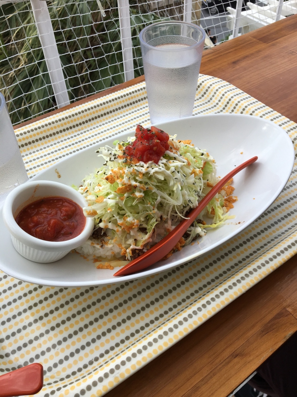 今回は2人で、タコライスとフィッシュアンドチップスを注文しました。食べる場所は店内とオープンエアの2か所。冬でも晴れていればオープンエアは気持ちがよいです。ただ風が強い日は少し厳しいかも。