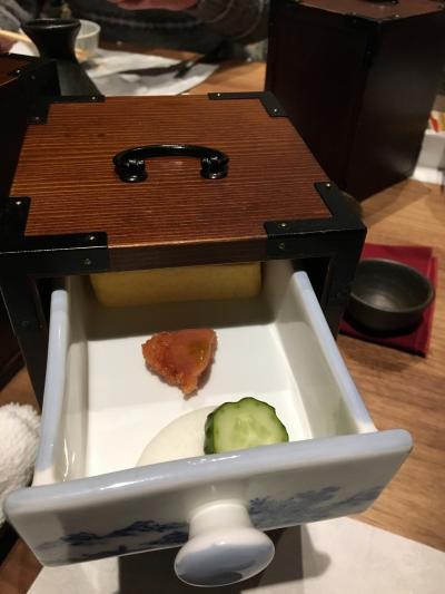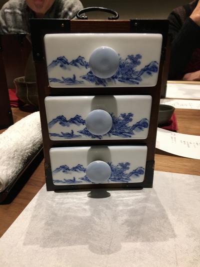 お料理も佳境に入って驚くのが、釜で炊きたてご飯と、ご飯のお供のセットです。1人ずつ3段の引き出しが運ばれてそれぞれの段に、明太子、焼き鮭、鯛茶漬け用の鯛、お漬物が入っています。お酒を嗜めない人への配慮が、また嬉しかったです。