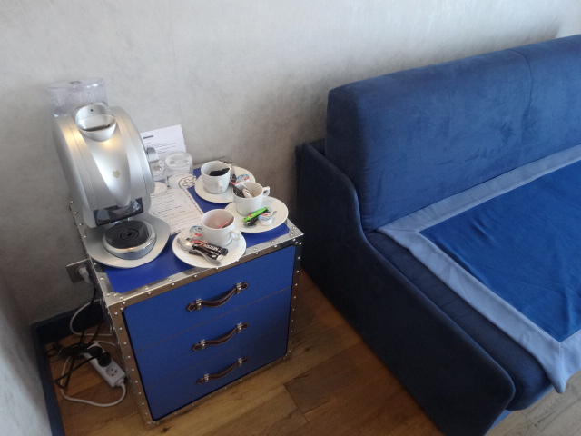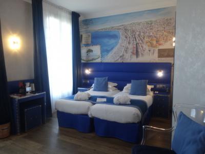 アヴィニョンからTGVでニース入りし、エズやモナコ、マントンなど電車を利用して近郊をまわり、その後ニース空港からブリュッセルへ移動する予定だったので、駅から近くのこちらにしました。駅の前の長いスロープを下って、駅から1段下がったところから海岸に通じる道沿いにあります。鉄道駅も空港行バスのバス停もトラムの停留所もすべて近いのでとても便利でした。スタッフもとても感じがよく、お昼前に到着したのに部屋に通してくれましたし、行きたい場所を伝えたら、バス停やバスの番号など詳しく教えてくれました。客室はとっても広々としていて青を基調とした内装もかわいらしかったです。