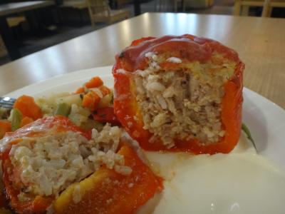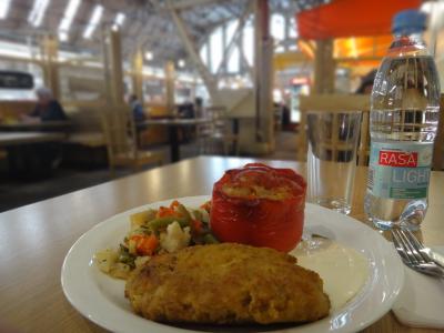 中央市場の中の食堂です。中央市場はドーム状の建物が5つ並んでいますが、一番端の1つだけ向きの違うドームの中にあります。ガラスケースの中にお惣菜が並んでいて、指差しで注文できるので旅行者に便利です。お店のお姉さんはにこやかで親切でした。コロッケのようなものと、ロールキャベツのパプリカ版?のようなものを食べました。美味しかったです。