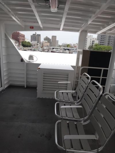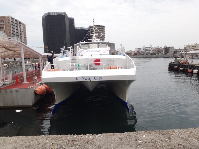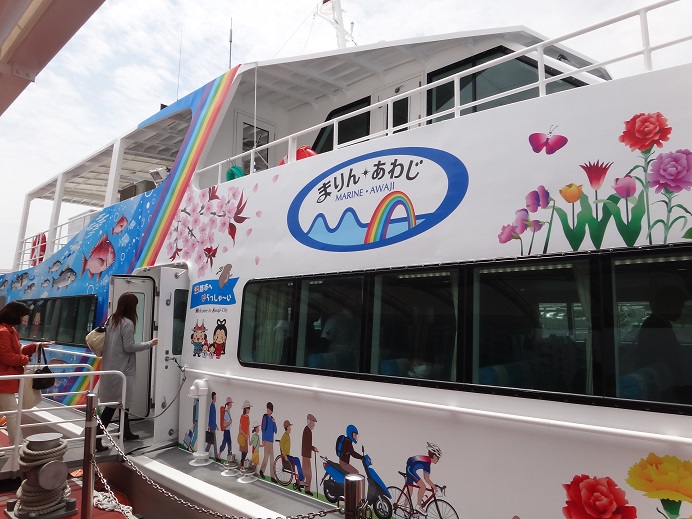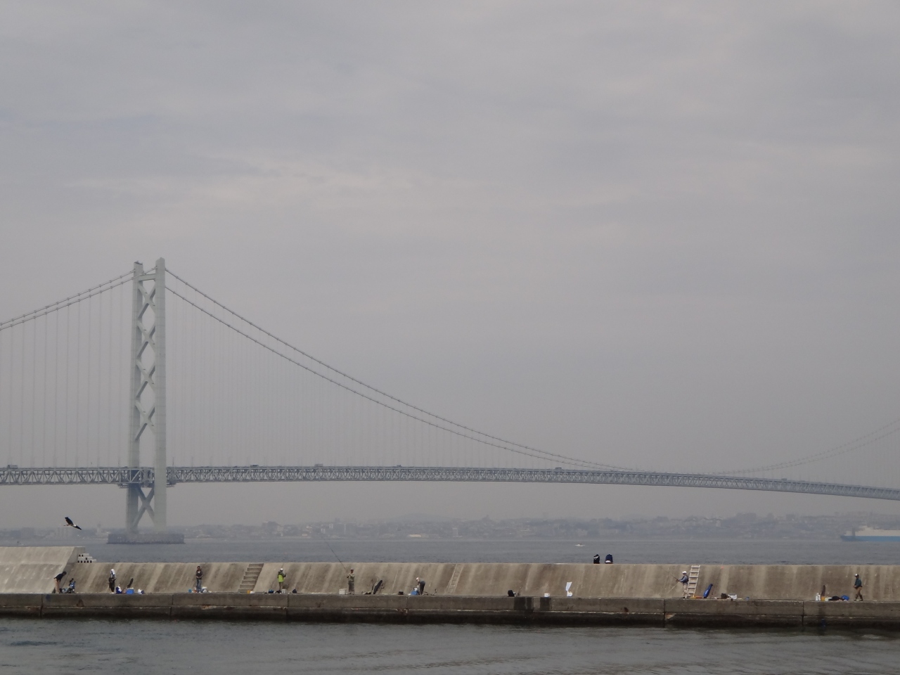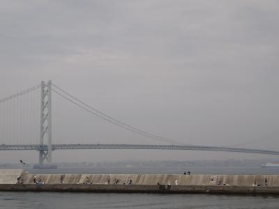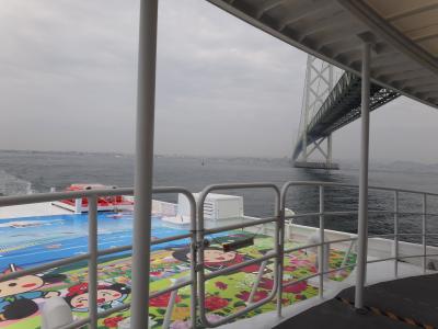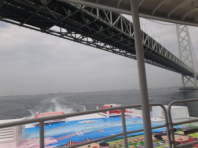 明石からジェノバラインに乗って淡路島の岩屋へ渡りました。その際に、明石海峡大橋の下をくぐりました。近づく時の迫力と、遠ざかって全体像が見えた時の美しさが印象的です。帰りは高速バスで明石海峡大橋の上を走りました。