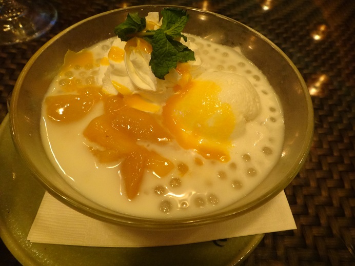夕食後にドリンクとデザートだけ頂きました。友人お勧めのタピオカとマンゴとココナツミルクのデザートをオーダーしましたが、東南アジアで食べ慣れている舌には、濃厚さが足りませんでした。お料理を食べていないのでそれだけで味の評価は出来ませんが、お店の雰囲気はとてもムードがあって素敵でした。