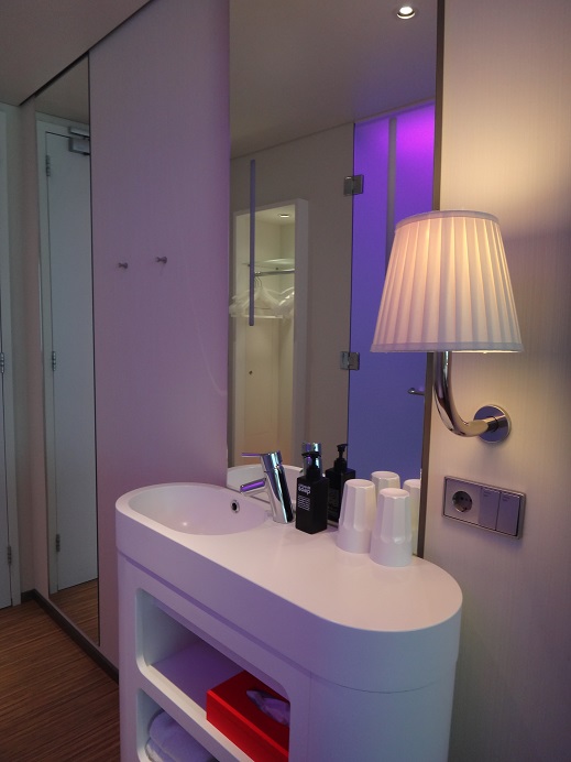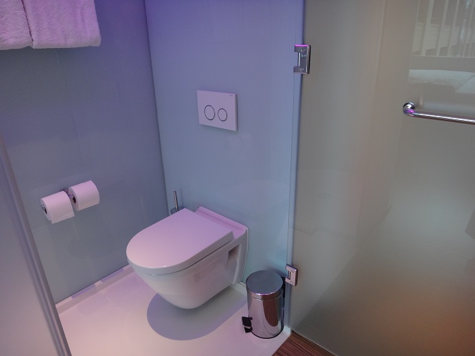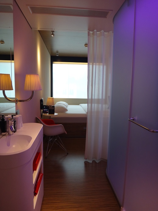 部屋は狭いですが、大き目のベッドがあって、窓が大きくて景色が良いです。部屋の電気やカーテンの開閉、アラーム、TVなどは全てタブレット操作です。部屋にいる時には飲み物とタブレットを枕元に置いて、ベッドの上で寛ぎました。カップル・子どもの小さい親子・1人旅には良いですが、友だちとだとちょっと窮屈な感じです。特に男性2人とかだと、困ってしまうかもしれません。