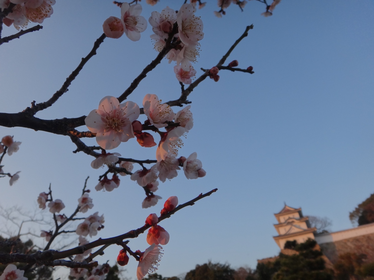 2月初旬、きれいな梅が咲いていました。ちょうど梅と明石城(櫓)が一緒に撮れる角度があったので、何枚かシャッターを切りました。明石城の見える場所にピンク・白・赤の梅が咲いていて、もう少し奥に歩くと椿が咲いていました。