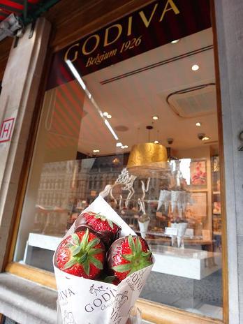 グランプラス店で、チョコレートがかかったイチゴを食べました。大きなイチゴが7粒くらい入っていました。美味しかったですが、まぁ想像通りの味でした。値段は覚えていませんが、高かったです。お隣のチョコレート屋さんにもそっくりなものがありました。