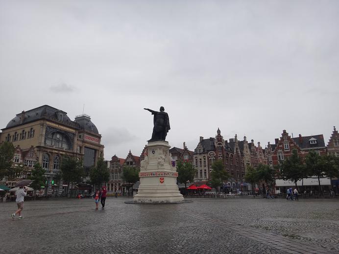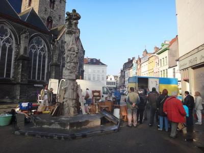 ゲントの中心地、コーレンマルクトから徒歩10~15分くらいです。中央にはヤーコブ・ファン・アルテフェルデの像があり、広場の周りにはカフェやレストラン、ブティックやアンティークショップに、ホームセンターまであります。この広場の一角に聖ヤコブ教会があり、その周りで毎週金曜日に蚤の市が開かれます。蚤の市は小規模でわざわざ行くほどではありませんが、たまたま金曜日にゲントに滞在する場合は、覗いてみると楽しいかもしれません。
