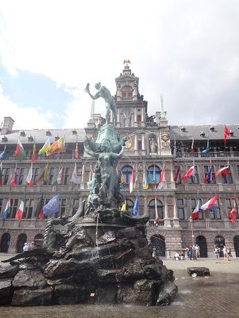 アントワープ市庁舎は、ノートルダム大聖堂のすぐ近くにあります。カラフルな万国旗が風になびき、銅像は噴水になっていて、水に光が当たり、とても楽しげな雰囲気です。晴れた青空が似合います。私が行ったのは夏だったのでとてもきれいでした。