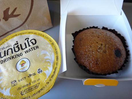 預け荷物はスラーターニーで自分でピックアップし、バスに乗せるのもフェリーに乗せるのも自分で運びます。フェリーのチケット売り場でスラーターニーまでのボーディングパスを見せてフェリーのチケットをもらう必要があります。特に説明がなかったのと、航空会社によって引き換えが不要な場合もあるらしく、フェリーに乗る直前になって、チケットを引き換えていない人が何人かいたので注意が必要です。機内では小さなミネラルウォーターとバナナカップケーキが出ました。