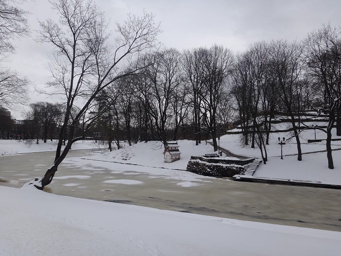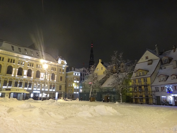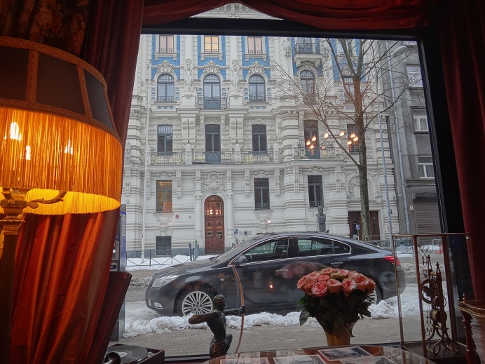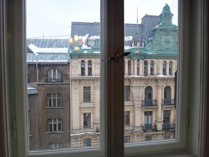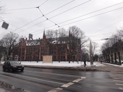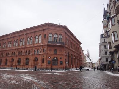 リーガ証券取引所美術館は、Doma広場を挟んで、リーガ大聖堂の向かいにあります。渋い赤一色の外観で、イェーカバ通りを挟んだお隣の建物(ラジオ局?)と合わせて、重厚な雰囲気が他の建物とは少し違って目を引きます。