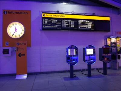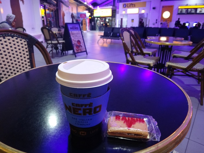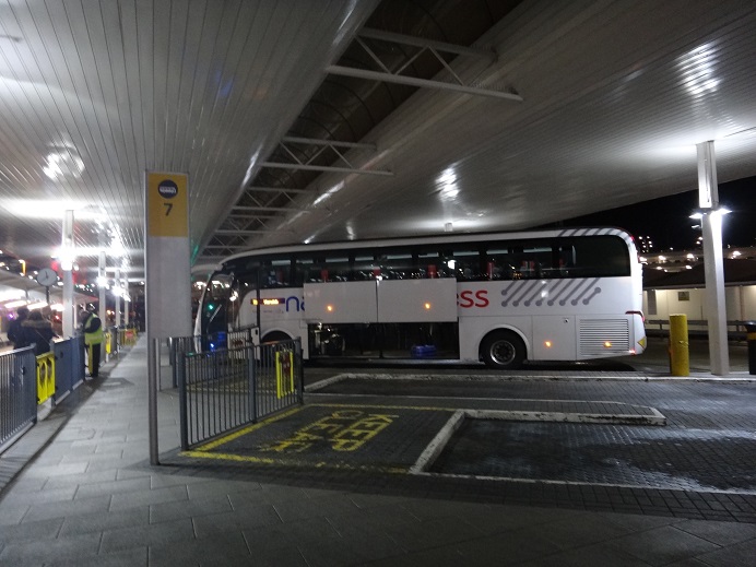ヒースロー空港からはずっと表示があるので迷いません。バスの時間を見てから空港に戻って空港探索するつもりでしたが、思っていたより遠かったので戻りませんでした。夜の10時前にバスターミナルに着いて、どのバスに乗れば良いのか分からなかったので、券売機ではなく窓口でチケットを買いました。私がチケットを買うとすぐに窓口が閉まったので、夜10時までの営業の様です。本数が少ないようで、1時間半待ちました。ターミナルはNational Expressのwifiが使えました。1軒だけカフェがありました(カフェNERO)