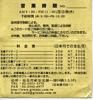 到着した翌日から体調がすぐれず、観光の予定も途中で引きえあげホテルで休んでいました。夕食を買うついでに寄ってみたら、いろんな相談にのってくれ30分の足もみでずいぶん楽になりました。そんなに混んでいないので私は通った2日間ともまったく待たされませんでした。受付にはJALのマイレージがたまる案内がありましたが、クレジットはだめのはず?今度行ったら確かめます。日本語大丈夫です。