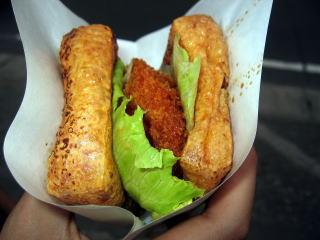 ひじき、にんじん、しいたけ、くるみ、たけのこの五目稲荷もおいしくいいものですが、おきつねバーガーなるものをみつけびっくり。油揚げにジュージーなお肉、野菜などをはさんだあんがいボリュームのある一品でした。豊川稲荷近くのうどん店「松屋支店」、1個250円。