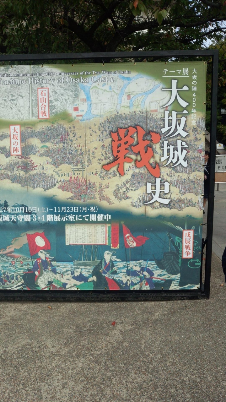 遠目で天守閣が見えてくると、そのスケールに驚かされます。ただ、近づくとバリアフリーのためのエレベーターがあったり、中に入ってもお城らしい造作もなく、いわゆる展示施設。ちょうど、大阪の陣400年ということで記念展をやっており、名だたる武将に関わる史料が見られたのは、よかったです。