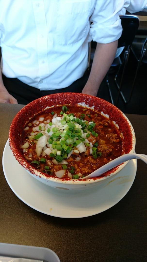 激辛は、テーブルに届いた瞬間に辛さでむせそうなほどの見た目。丼の口の部分(縁の内側)にびっしりと唐辛子がまぶされており、スープも真赤。かなり辛さに強い後輩が食べました(いじめではありません。自らの選択です)が、最初は苦戦していました。せっかくなのでスープを味わおうと、レンゲにいっぱいもらったものの、レンゲの周辺に唐辛子が大量に付き、自分のスープで洗い流してしまいました。