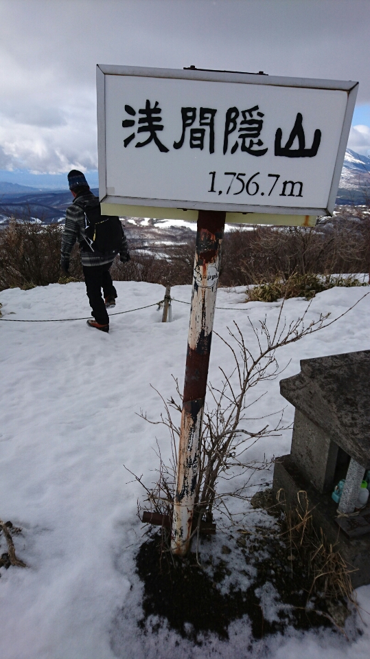 群馬県の高崎市倉渕地区から嬬恋村の北軽井沢に抜ける二度上峠の頂上から少し高崎側に登山口があるので、そこから北軽側に50メートルほどの路肩にある駐車場に車を置いて、スタート。登山道の8割方に雪が残り、ところどころ固く凍っているところもあり、軽アイゼンでは少し難儀をしましたが、1時間20分ほどで頂上に到着。