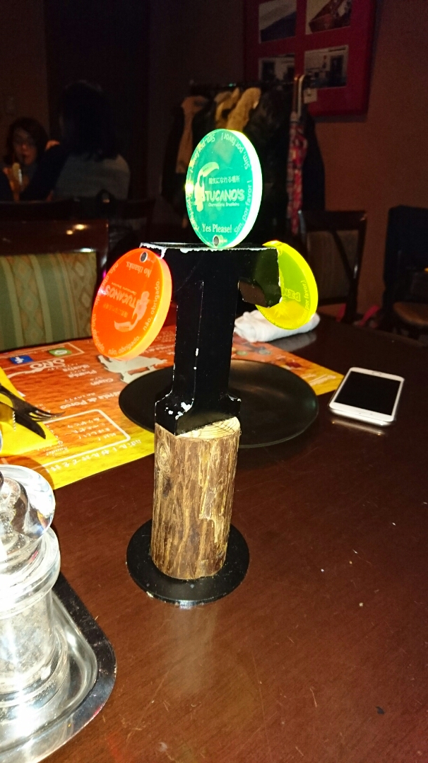 2時間食べ放題、飲み放題のコースを予約しておいたので、入店するとすぐ客席に通され、お店のシステムの説明。お店の頭文字「T」をかたどった置物の上に緑、黄、赤のプラスティック製のコイン状のものがあり、緑を立てておくと「お肉ください」黄は「焼きパイナップル頂戴」、赤は「ごちそうさま」の印。肉とパイナップルのサービス係は、このコインを探して、提供にくるので、一休みしたいときは、寝かせておきます。