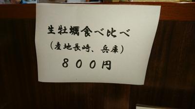 カウンターに案内され、前を見ると、「牡蠣食べ比べ」の張り紙が。早速、冷酒と一緒にオーダーしました。さらに、メニューを眺めていると、金目の煮つけがおいしそうで、定食にすると小鉢などがついて割安だったので、そちらを追加注文しました。
