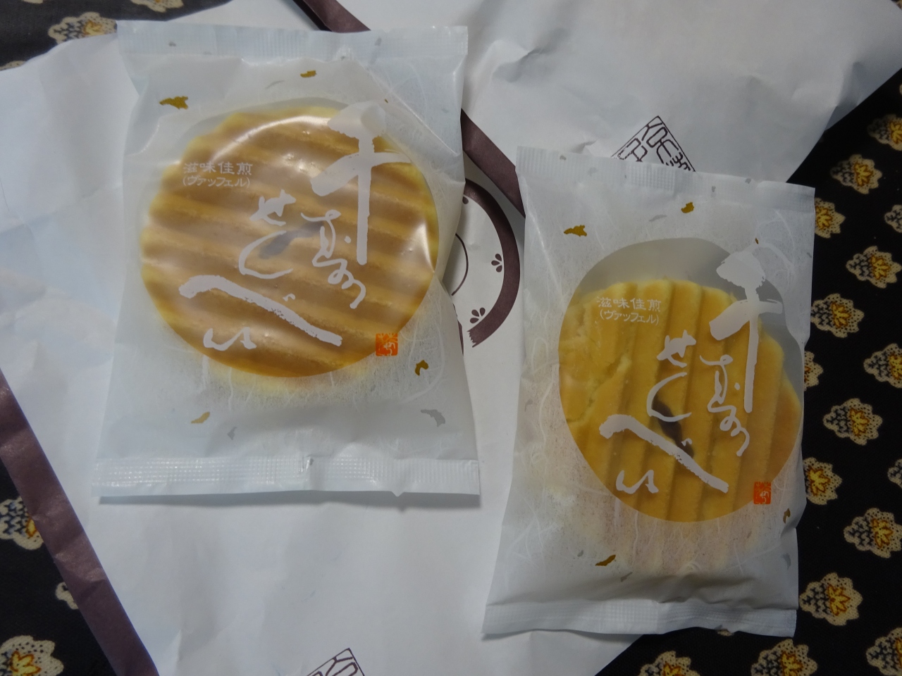 こちらではクーポンで千寿せんべい2個を頂けます。波型が特徴的な千寿せんべいは土産として持ち帰り。シュガークリームが入ったクッキーのようなお菓子でした。