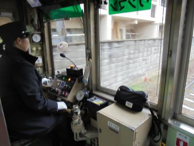 一両単行で日中は10分間隔で運行されるため車内は比較的混んでいますが、運転席横から前面展望を楽しむのがよいかも。