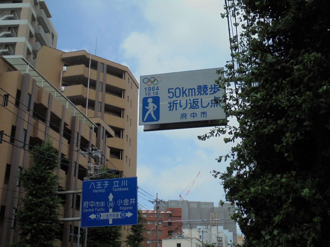 マラソンより長い距離で行われる競歩。前回の東京五輪での競歩折り返しの記念碑は、マラソンの記念碑がある場所(調布市の味スタ前)よりもさらに西側、甲州街道沿いの府中市中心部に設置されています。