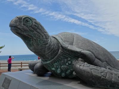 親不知海水浴場の砂浜が眼の前に広がり散策が楽しめるスポットです。駅内には全長6メートルのウミガメ像のような見どころも。