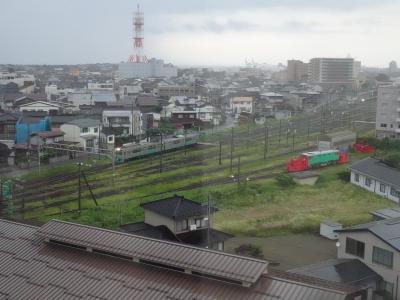 上越市の直江津駅から近いビジネスホテル。すぐ横をえちごトキめき鉄道が走り、長編成の貨物列車が通過するときはガタゴトと心地よい音色が聴こえてきます。