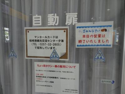 下水道広報プラットホームでは、営業時間は9:00~17:00、年末年始が休みとされていましたが、日曜日の昼前に訪れたところクローズ。マンホールカードは「柏崎港観光交流センター夕海で配布しています」との掲示があり、結局3キロ離れた柏崎港に脚を運びました。