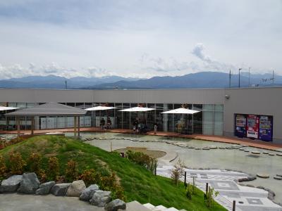 到着して驚いたのは、パーキングと施設との間には「山」が聳え、駐車場からは中の様子が分からないこと。山を上ると視界が開け、道の駅の全景のほか正面には北アルプスの山並みが望めるなどなかなかの仕掛けです。(外側をぐるっと廻れば、坂も階段も使わずにメイン施設へ行くことが可能)