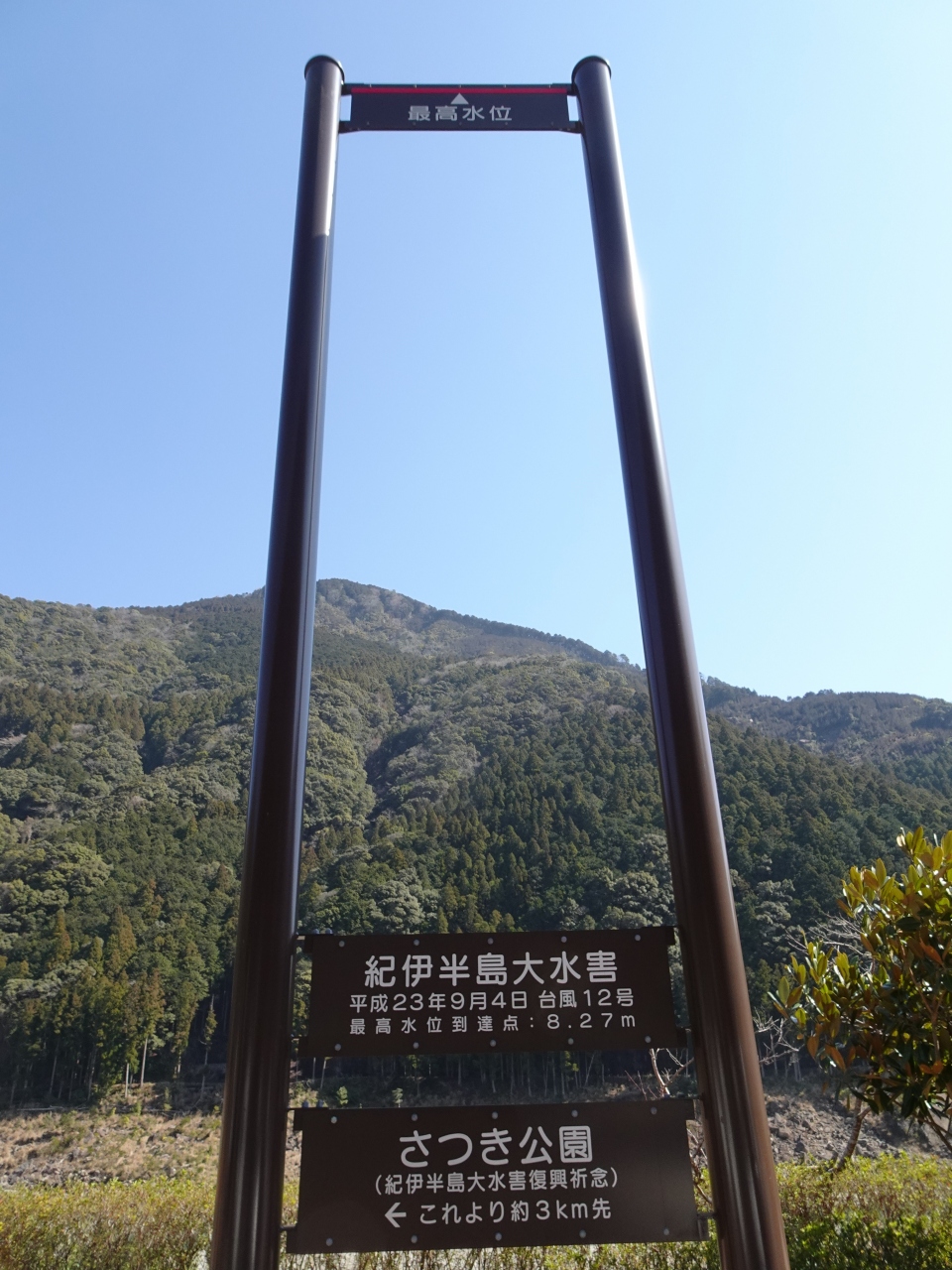 訪れた日熊野川の流れは穏やかでしたが、平成23年9月の台風12号による氾濫から道の駅の施設も大きな被害を受けたようです。駐車場の脇には熊野川の最高水位8メートルを記す塔があり、自然災害の恐ろしさを感じます。- 旅行時期