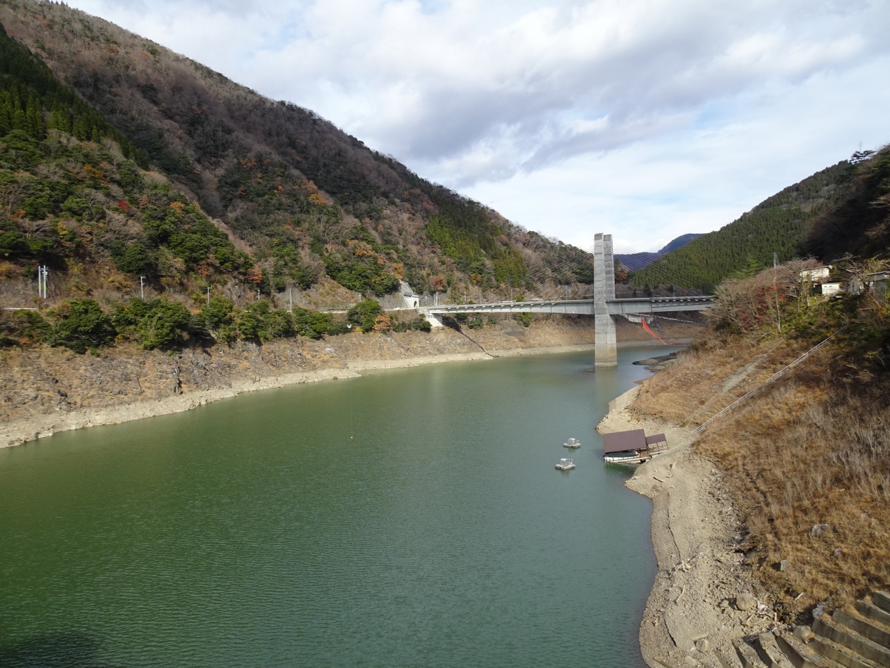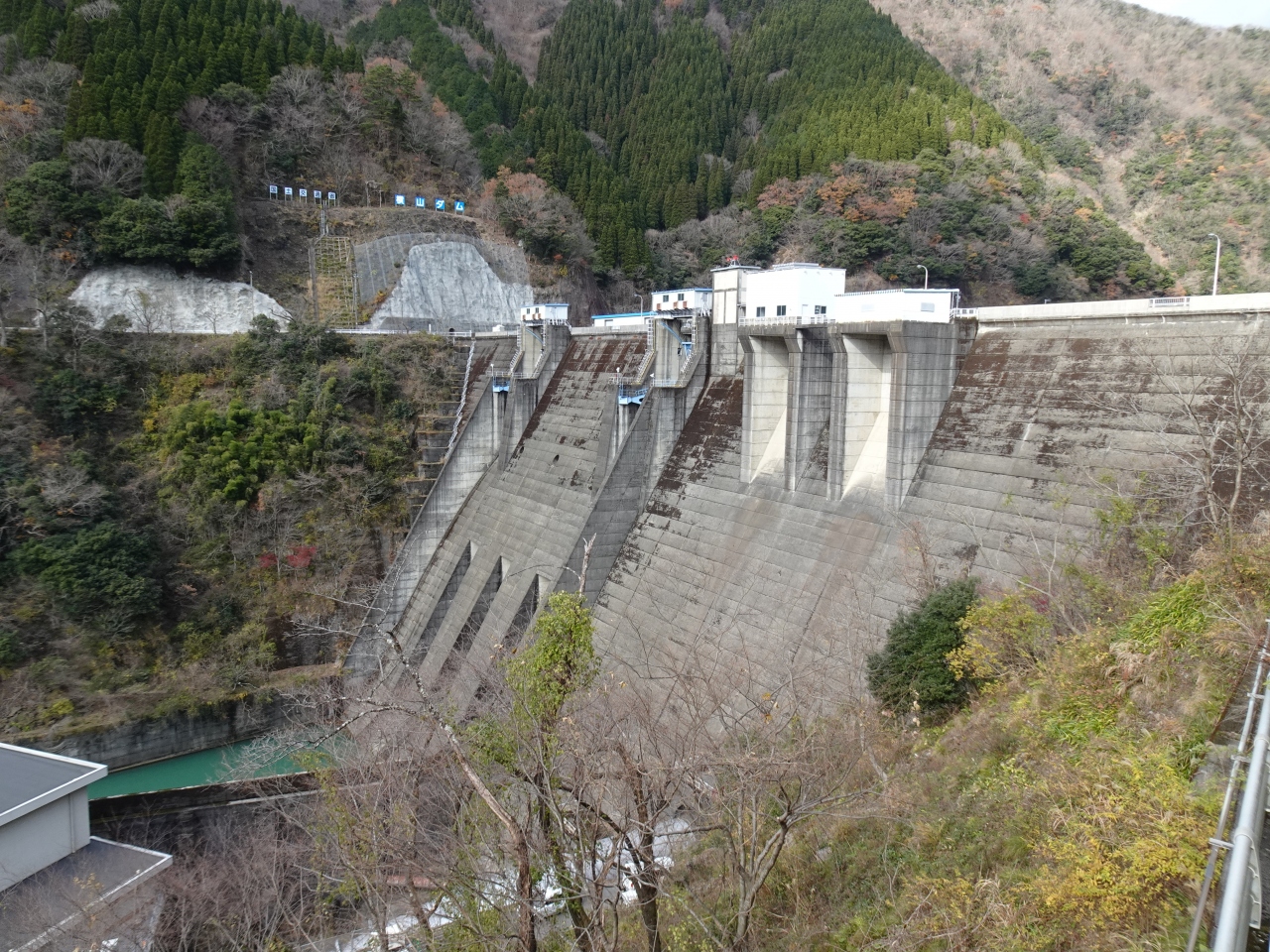 「中空重力式」は全国に13箇所しかない珍しい形式。内部に空洞を造りコンクリートなどの材料費を節約したとのこと。人件費より材料費の方が高かった昭和中期に採用された型式だそうです(横山ダムは1964年に完成)。外観からは空洞かどうか分かりませんが...