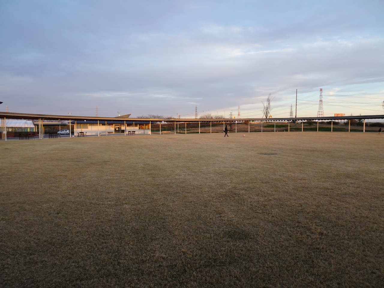 建物の前には円形の芝生広場があり、周りを直径60メートルの屋根付回廊が囲み眼を惹きます。