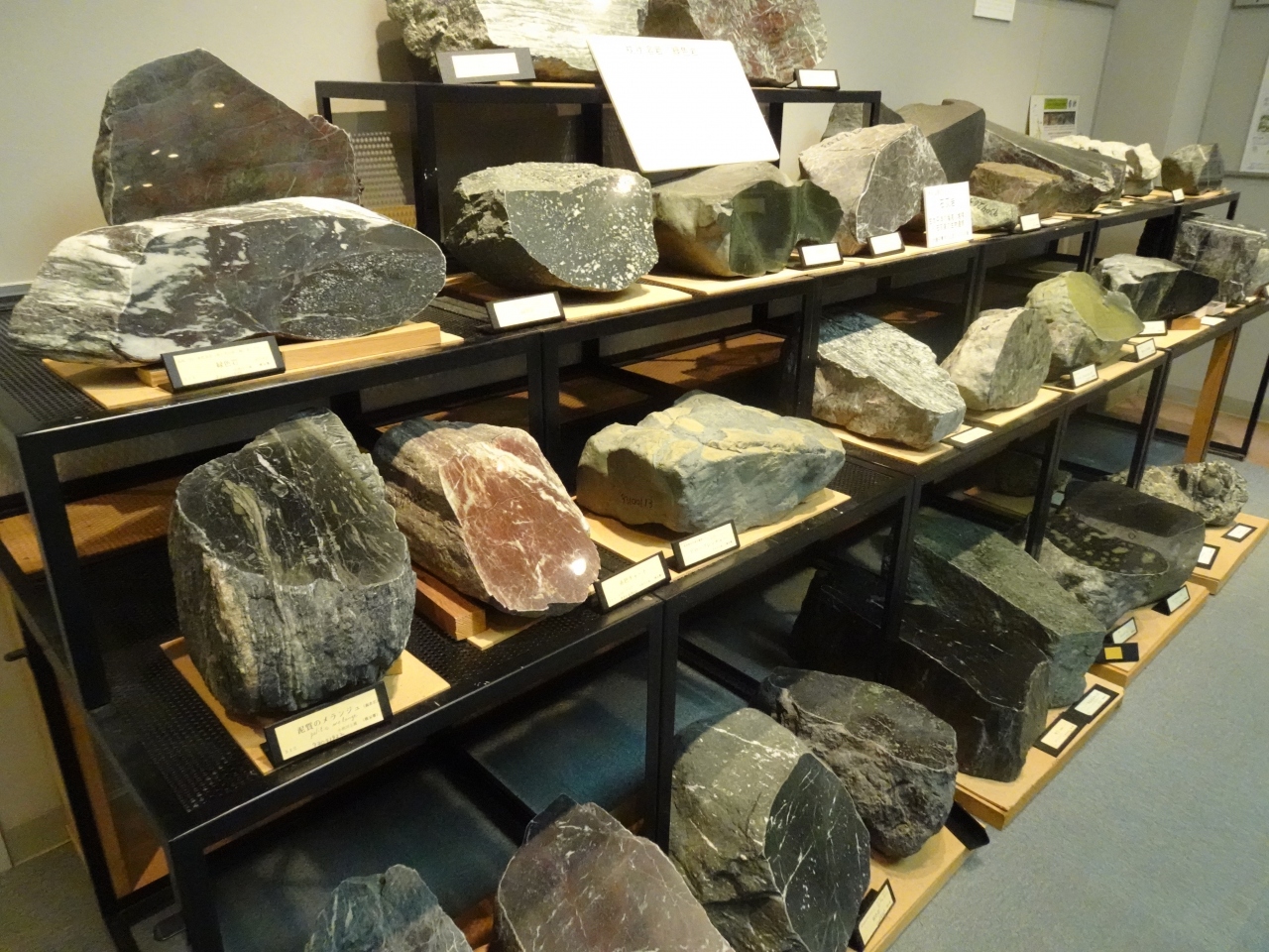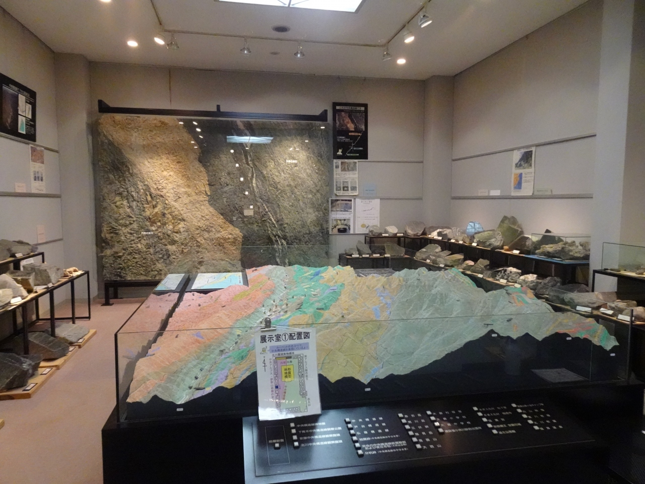 メインは1階の展示室。展示室自体を大鹿村とみなし、村内の位置に合わせ岩石標本が展示されているのが特徴。中央構造線の伊那山地(内帯)側と赤石山脈(外帯)それぞれの岩石が実際の配列に合わせ展示されるというこだわりの強さを感じられます。