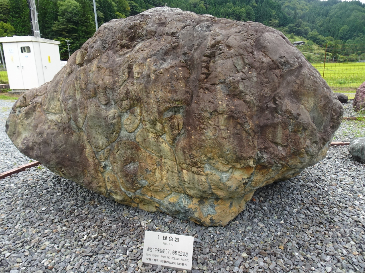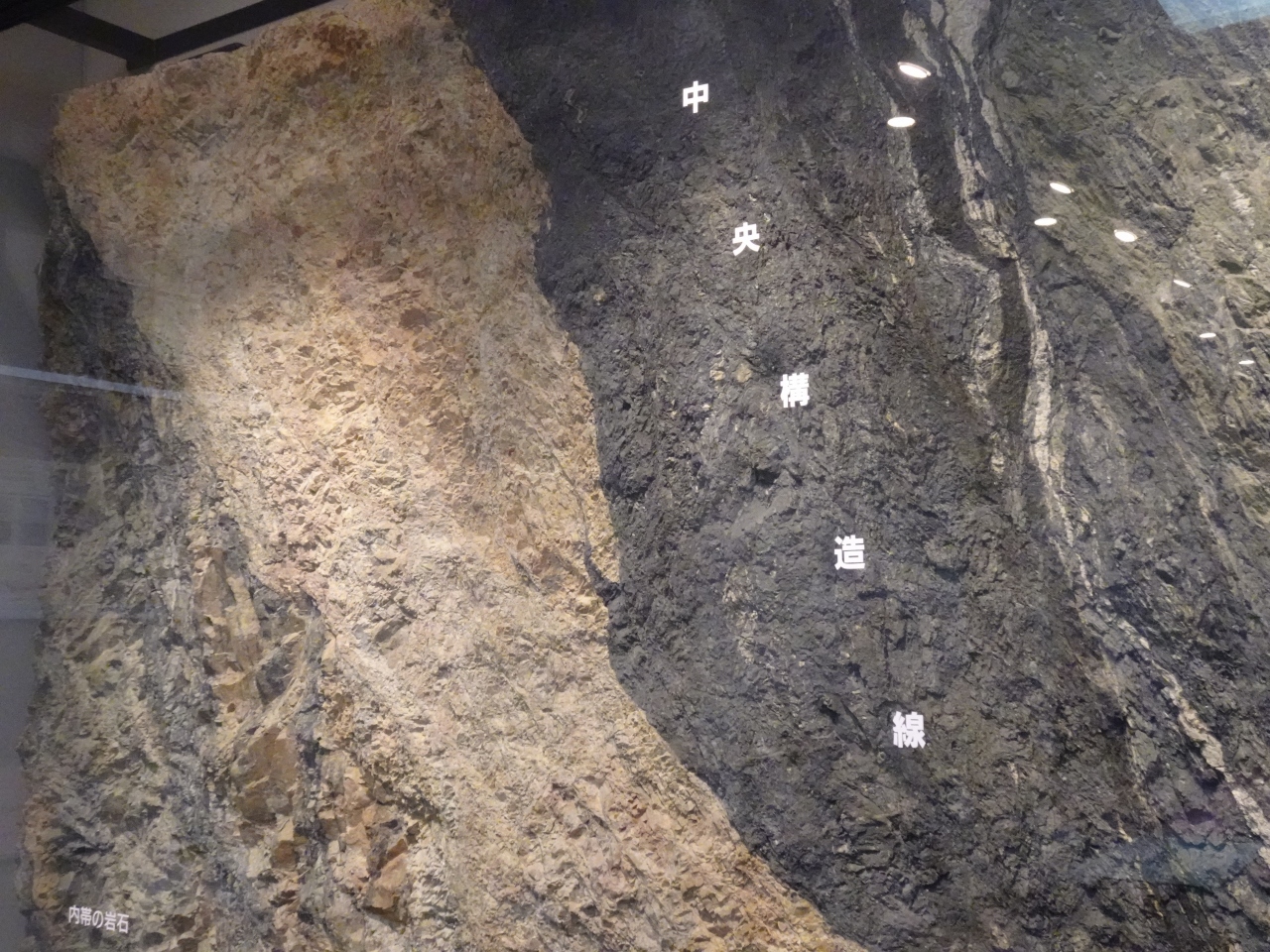 また展示室奥には中央構造線「北川露頭」のはぎとり標本が設置。道幅が狭いいわゆる酷道沿いにの露頭まで脚を運ばなくても、中央構造線の両側の岩石の違いをはっきり確認することができます。