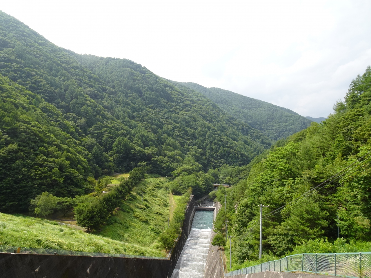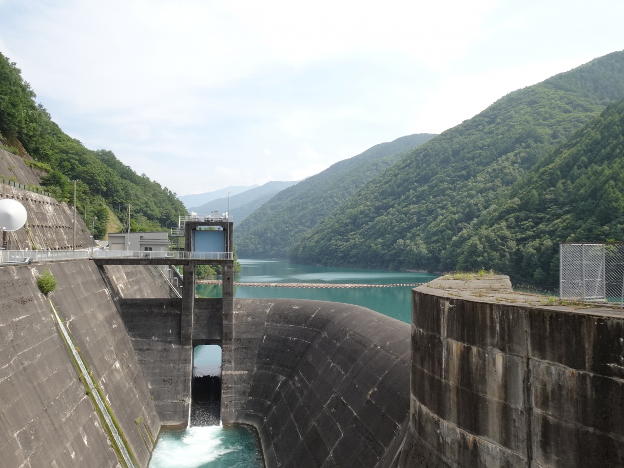 県道493号線沿いに数台分の駐車スペースがあり、すぐ横の管理事務所でダムカードを頂けます(長野県所管のため配布中止にはなっていない)。堤防に立ち入りできるのは道路側のわずかな部分だけですが、高さは60メートルほどあり相応の迫力は感じられます。