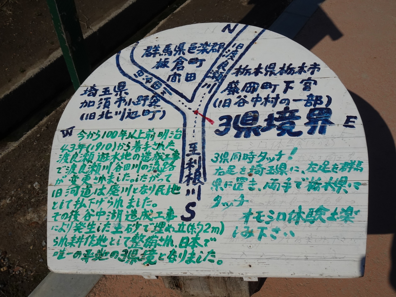 群馬県と埼玉県そして栃木県の3県の境界が平地に存在する貴重なスポット。