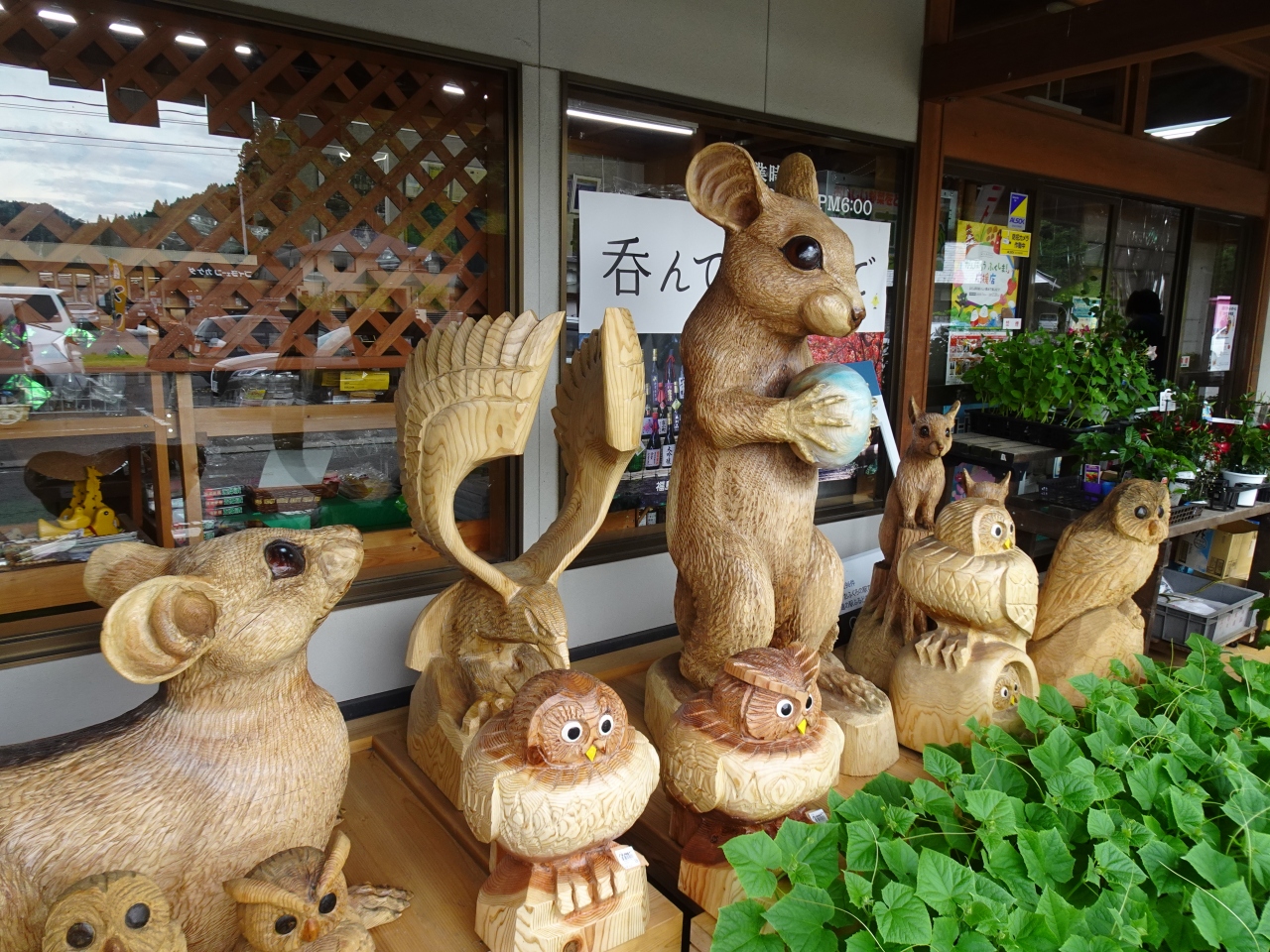 建物の手前には木彫りの動物たちが並び眼を惹かれました。(一部は値札が張られ販売されています)- 旅行時期