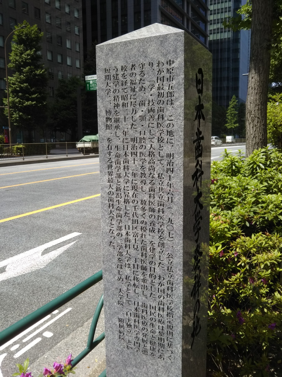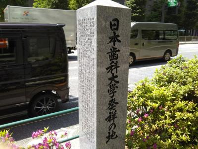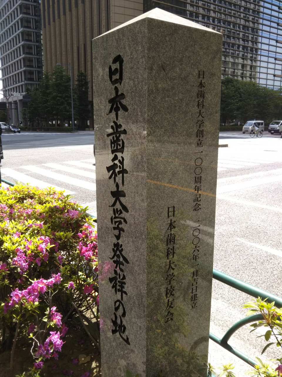 大手町の交差点の北東側、大手町ファーストスクエアの横に立つ記念碑。オフィス街のど真ん中に歯科大学があったとは意外な気もしますが、創立された明治40年当時は大名屋敷に代わり官公庁が立ち並んでいた区域のため、学校があっても不思議ではないのでしょう。
