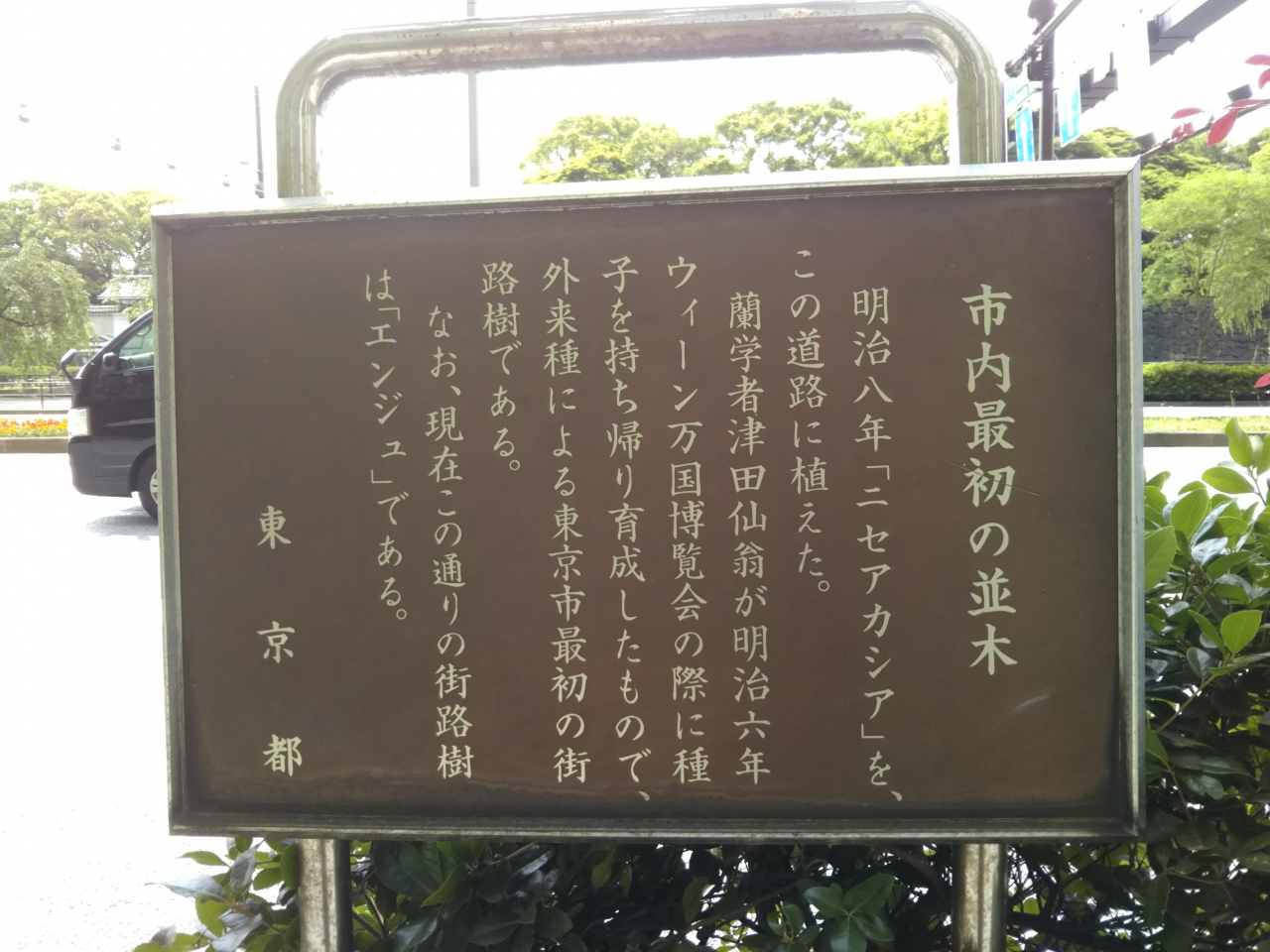 碑の横の簡単な解説によれば、明治8年にニセアカシアが植えられ東京市内最初の街路樹となったそうです。