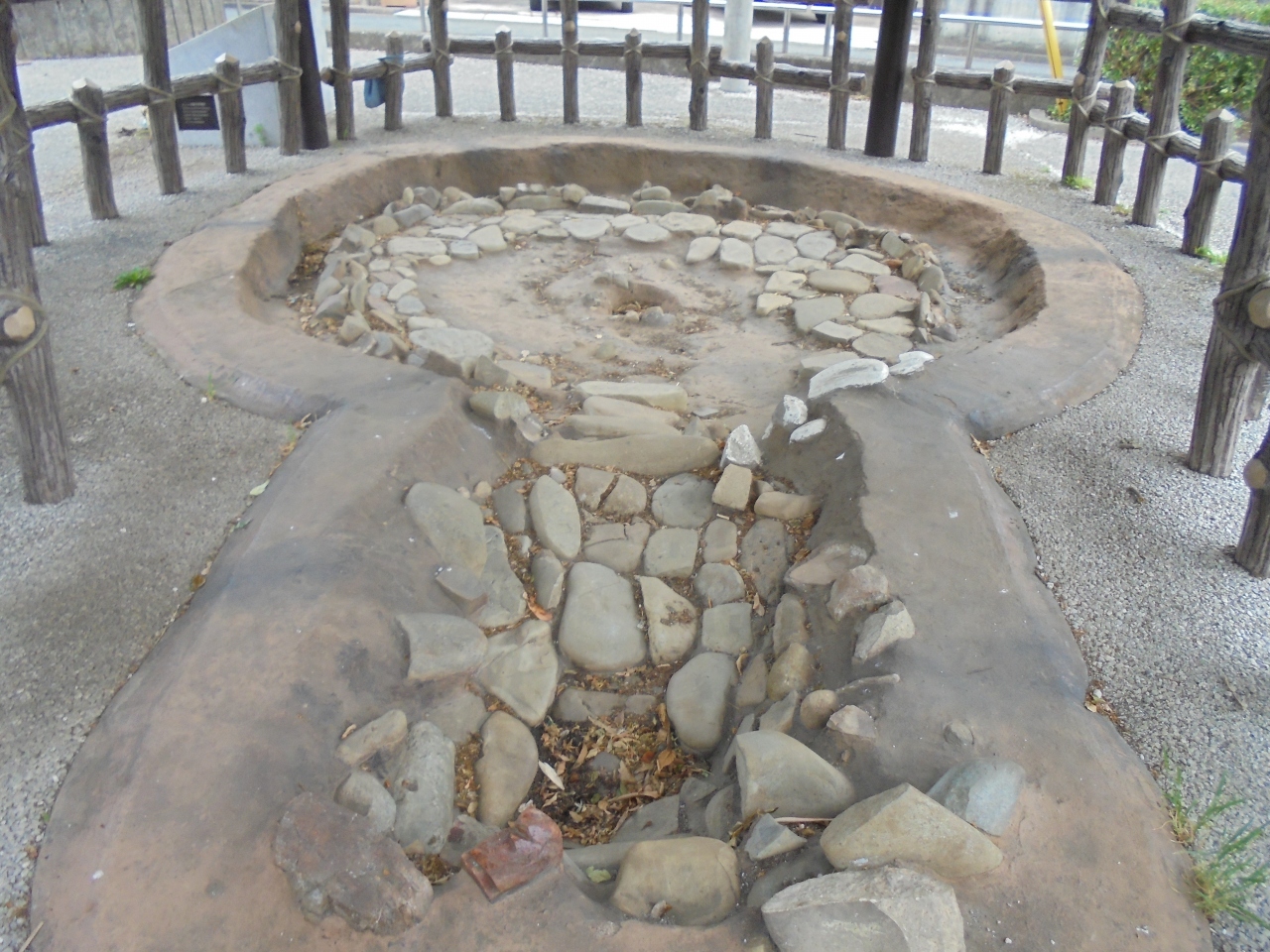 公園の一角には屋根と柵で覆われた物件があり、近づいてみると鍵穴を大きくしたような石で敷き詰められた遺跡があります。
