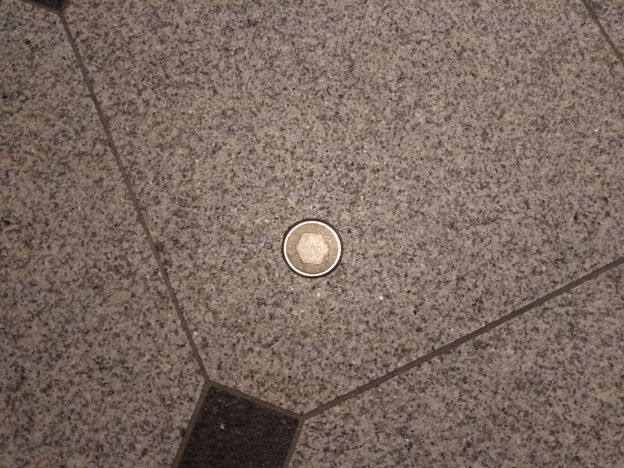 やや分かりにくい場所ですが、通路真ん中の案内所が目安。新幹線改札に向かう階段手前の床に小さな○形の印があります。また壁には事件の概略を記したプレートが掲げられています。