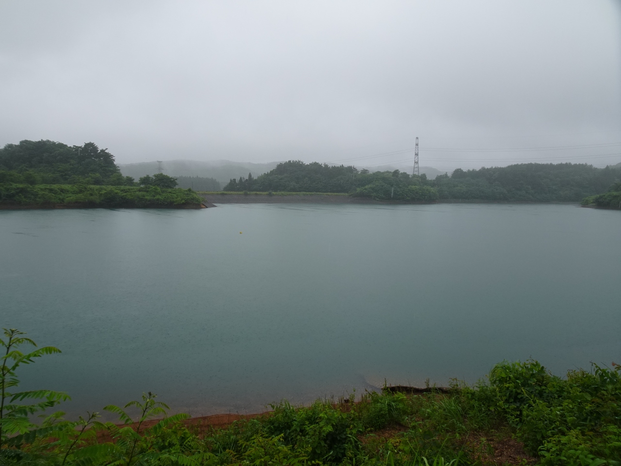 ダム湖はバス釣りのポイントになっていて、雨にもかかわらず合羽を着た釣り人の姿も見られました。