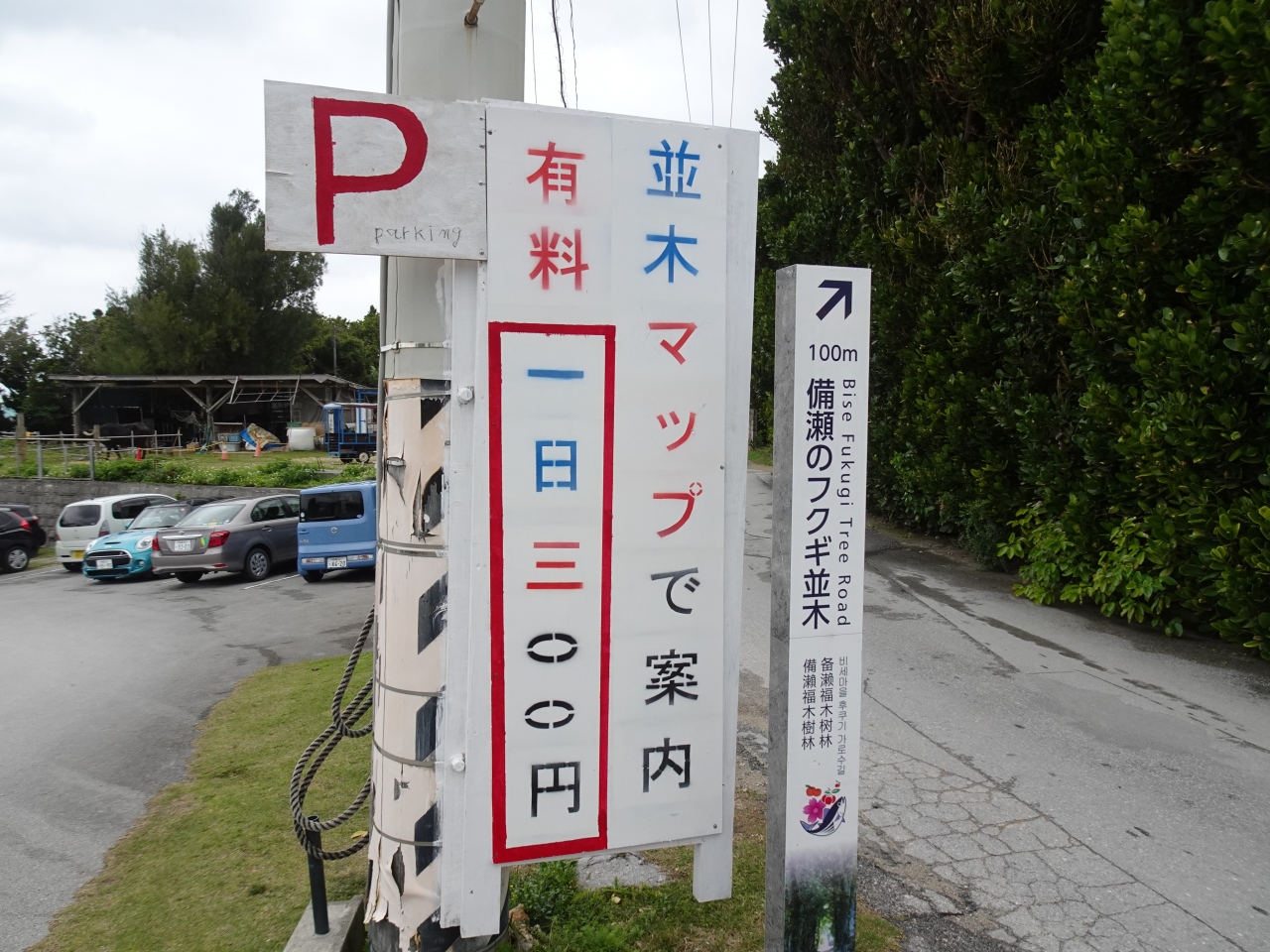 車の場合、並木道の入口に無料駐車場があります。ただしその手前にお婆さんが手招きし何も知らないドライバーが次々に有料(300円/回)のパーキングに吸い寄せられていきます(我々も)。